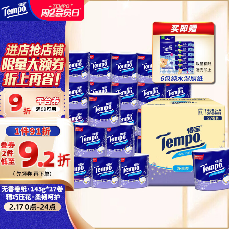 得宝(TEMPO)一博同款 有芯卷纸 无香4层145g*27卷 可冲散 卫生纸 卷筒纸