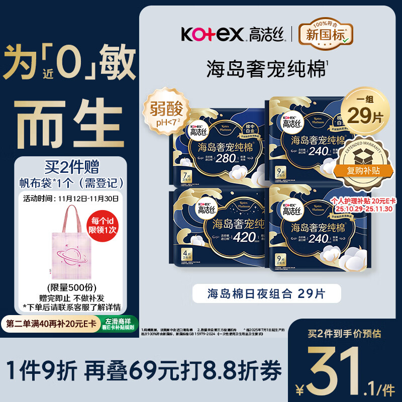 高洁丝【近0敏海岛棉】奢宠纯棉卫生巾4包29片日夜组合姨妈巾京东自营