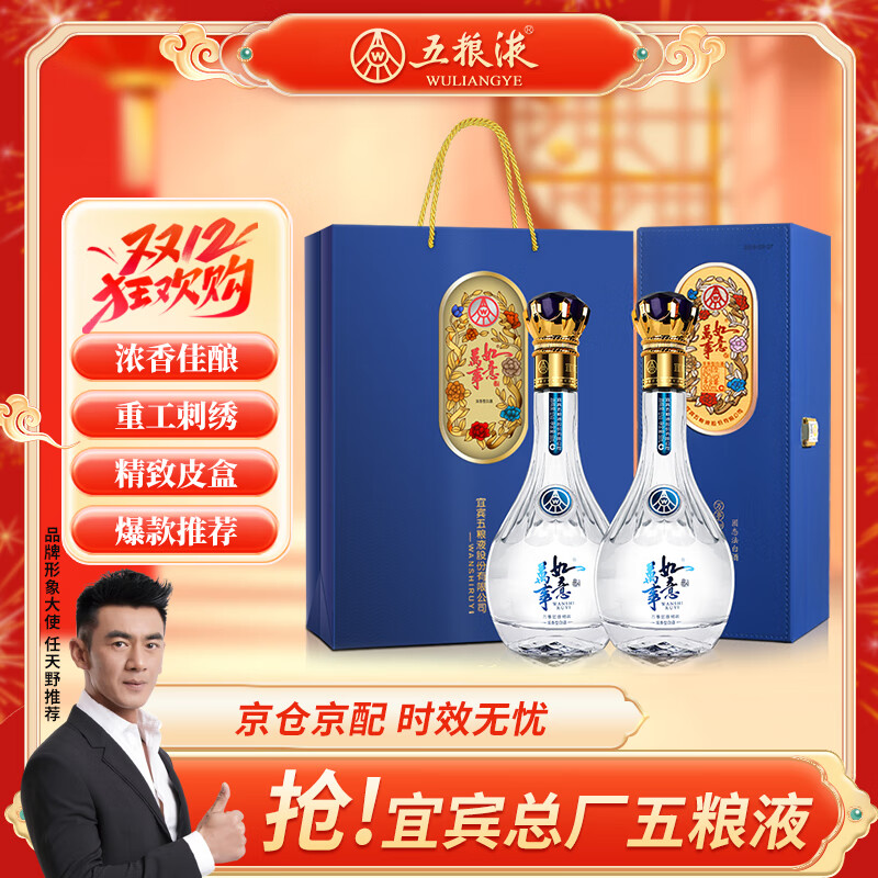 五粮液股份 双12钜惠万事如意精致52度500ml*2瓶刺绣皮盒纯粮浓香型白酒