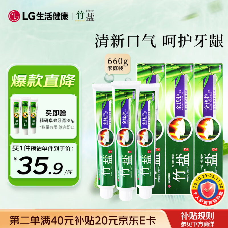 竹盐LG全优护牙膏220g*3支牙龈护理清爽口感减轻牙渍清洁口腔