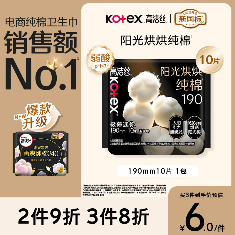 高洁丝【纯棉NO.1】阳光烘烘卫生巾190mm10片日用护垫迷你巾京东自营
