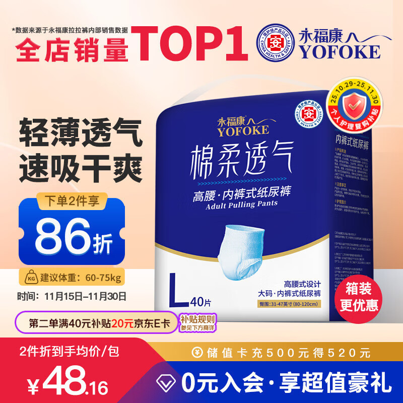 永福康绵柔透气成人拉拉裤L40片 臀围80-120cm 老人孕产妇内裤型纸尿裤