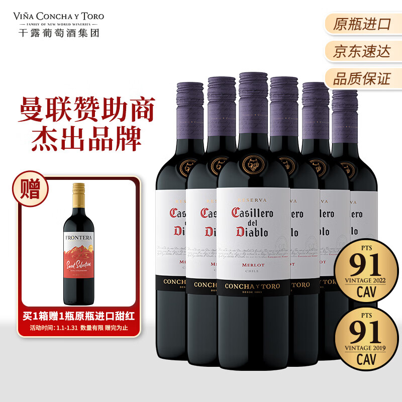 红魔鬼(Casillero del Diablo)梅洛干红葡萄酒 750ml*6瓶整箱装 智利原瓶进口红酒 热门商品
