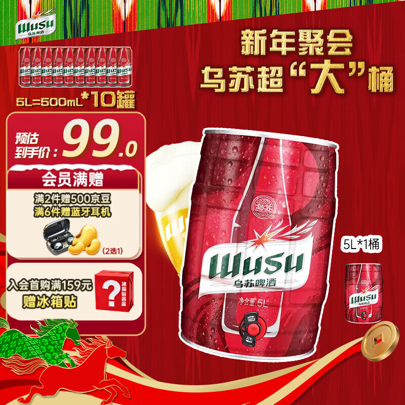 乌苏啤酒(wusu)大红乌苏烈性精酿小麦啤酒5L桶装京东自营踏青出游