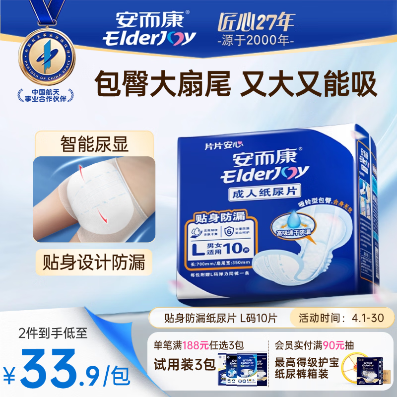 安而康(Elderjoy)贴身防漏成人纸尿片L10片70*35cm漏尿护垫尿片老人附网裤男女