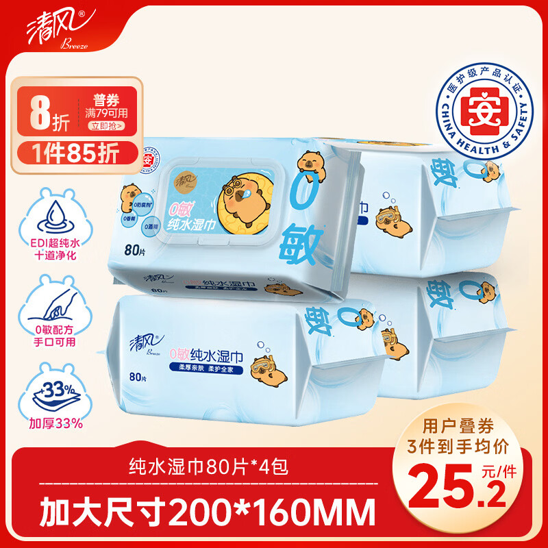 清风EDI纯水湿巾 80片*4包 不含酒精 手口可用 大包湿纸巾