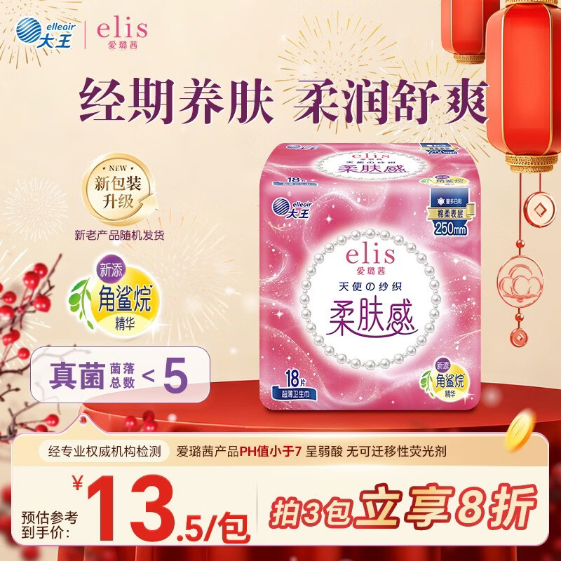 爱璐茜(elis)大王天使纱织日用卫生巾250mm18片 超薄棉柔超净吸透气无感姨妈巾