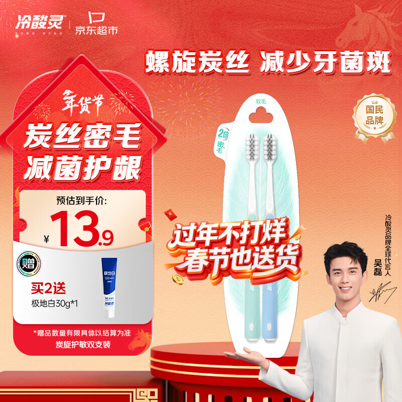 冷酸灵炭旋护敏软毛成人牙刷减菌护龈 便携2支装颜色随机【吴磊推荐】