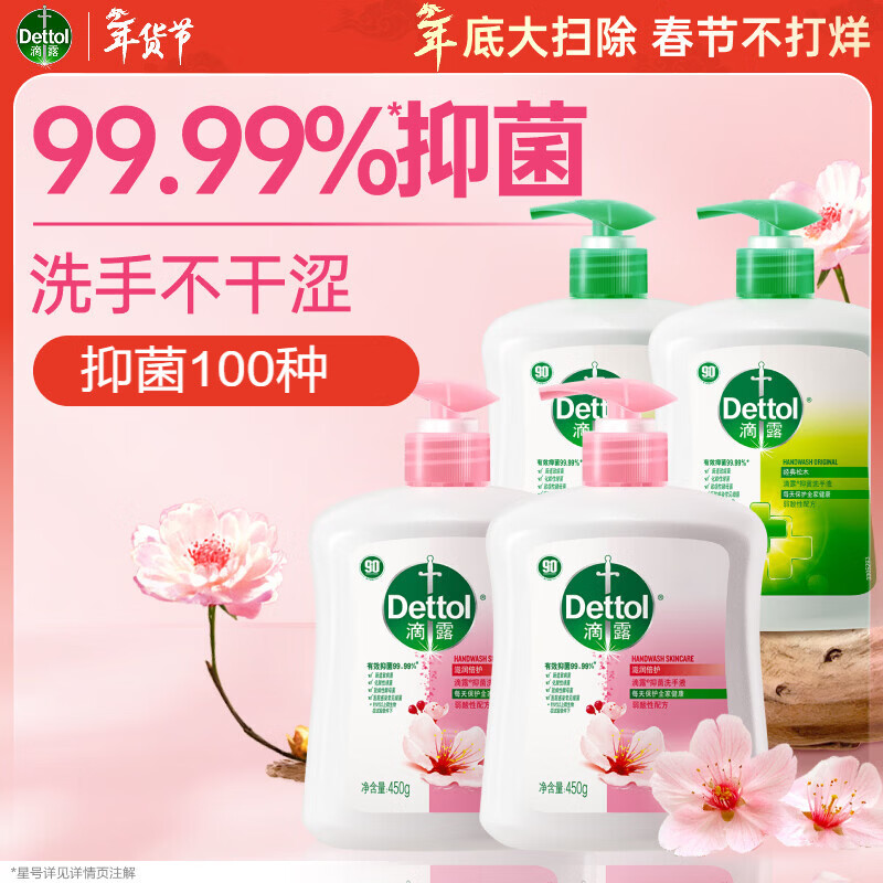 滴露(Dettol)洗手液抑菌杀菌消毒 滋润450g*2+松木450g*2儿童家庭补充装温和