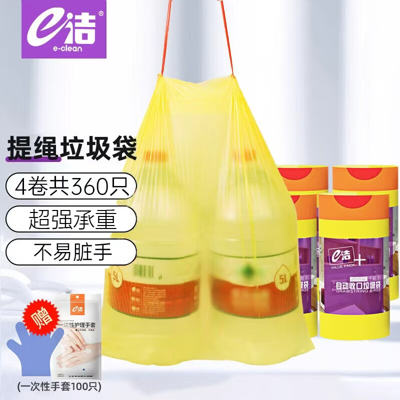 e洁 抽绳垃圾袋黄色45*50cm4卷共360只单面1丝点断家用手提垃圾袋