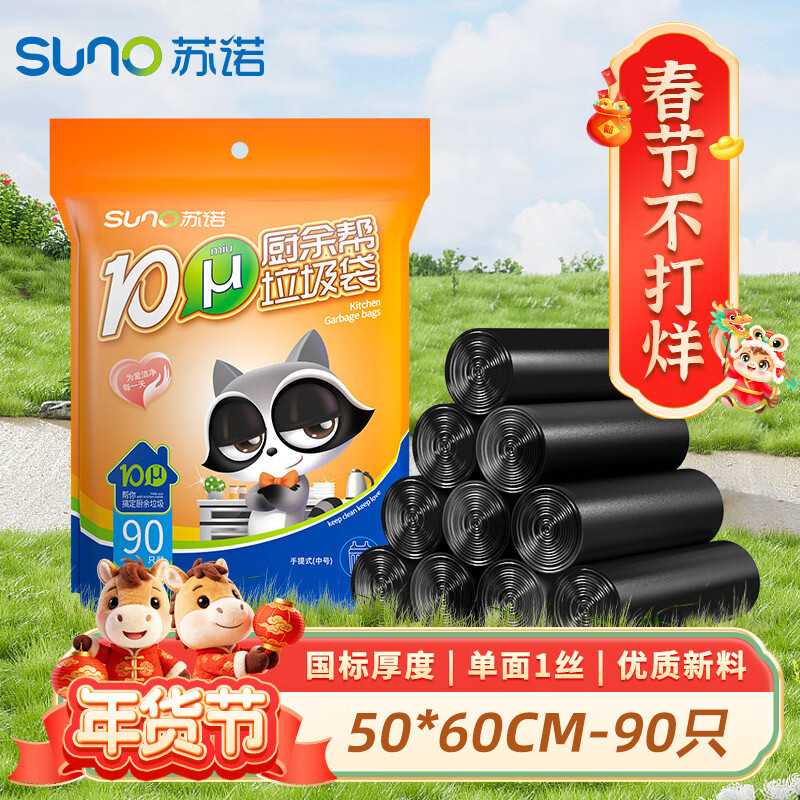 苏诺背心式垃圾袋黑色50*60cm*90只单面1丝加厚厨余专用厨房垃圾袋