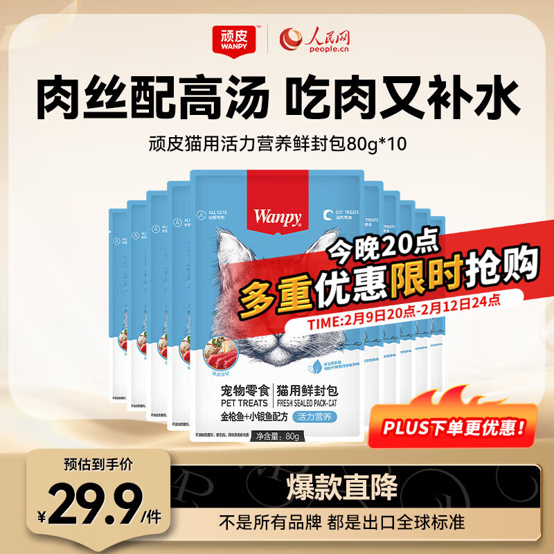 顽皮(Wanpy)猫零食金枪鱼小银鱼鲜封包800g(80g*10包)猫粮湿粮