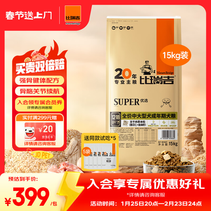 比瑞吉狗粮优选系列中大型犬成犬果寡糖不含麸质促进消化草本冻干 15kg