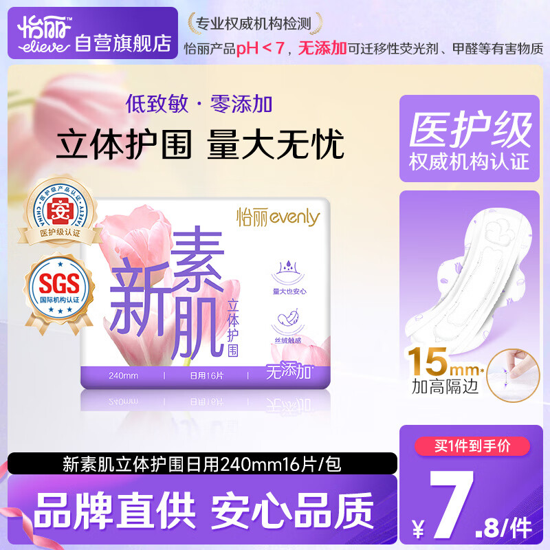 怡丽医护级卫生巾棉柔透气立体护围批发日用240mm16片京东自营姨妈巾