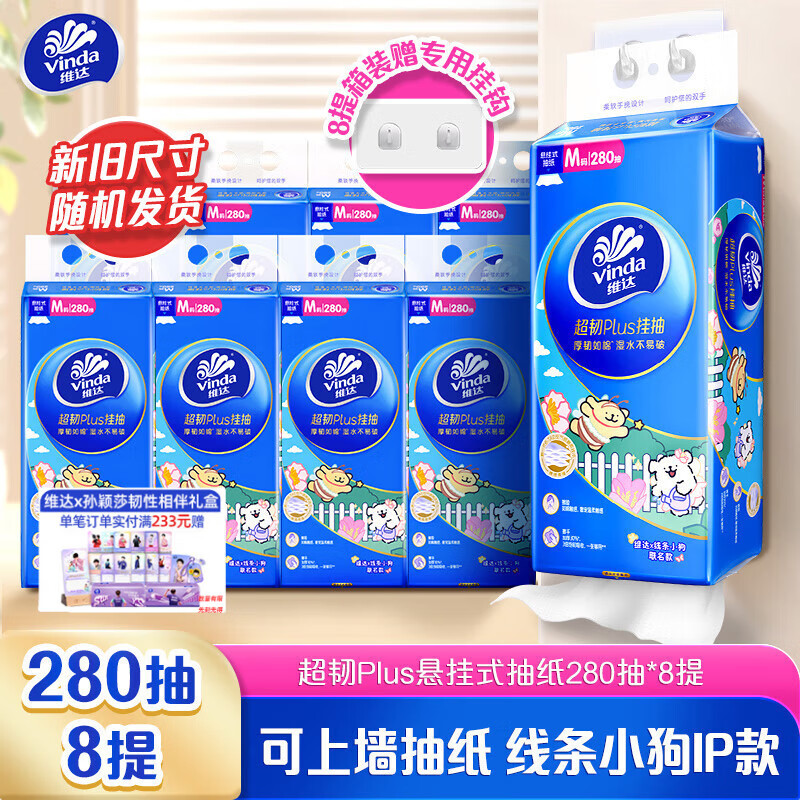 维达(Vinda)抽纸 超韧Plus挂抽3层280抽*8提M码悬挂式线条小狗款新旧随机发货
