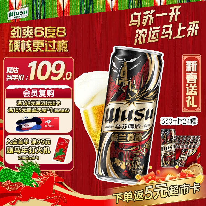 乌苏啤酒(wusu)京东自营楼兰秘酿330ml*24罐/箱整箱装精酿啤酒婚宴新春送礼