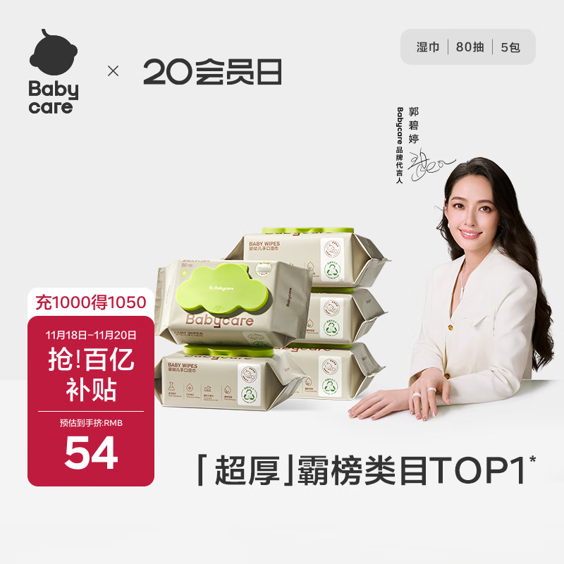 babycare婴儿手口湿巾新生儿湿纸巾宝宝带盖大包装 3150绿盖湿巾 80抽*5包