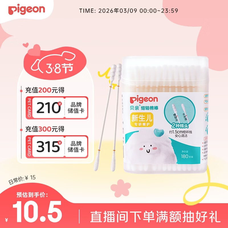 贝亲(Pigeon)婴儿棉签 细轴棉棒 耳孔清洁棉签 肚脐清洁棉签 180支装 KA01
