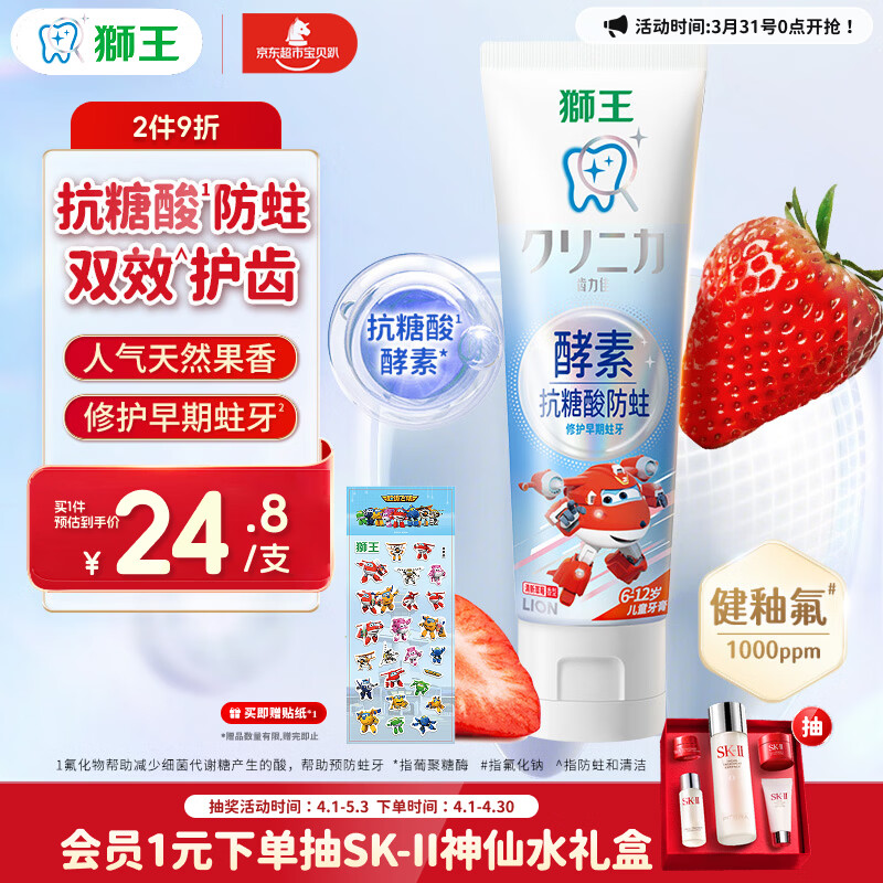 狮王(lion)齿力佳酵素抗糖防酸蛀儿童牙膏含氟6-12岁草莓味60g