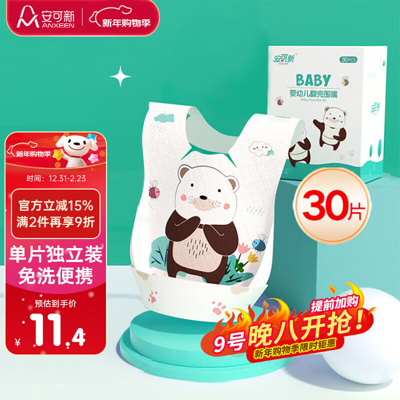 安可新 婴幼儿一次性翻兜围嘴【30片装】独立装宝宝免洗围兜口水巾 萌熊