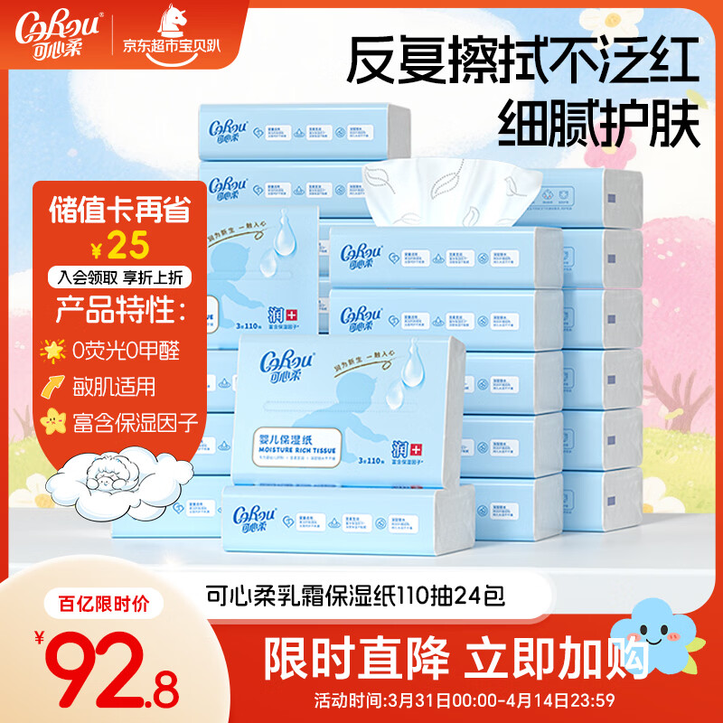 可心柔(COROU)婴儿纸巾 云柔巾 3层110抽24包 S码 婴童适用 家庭装 乳霜纸 抽纸