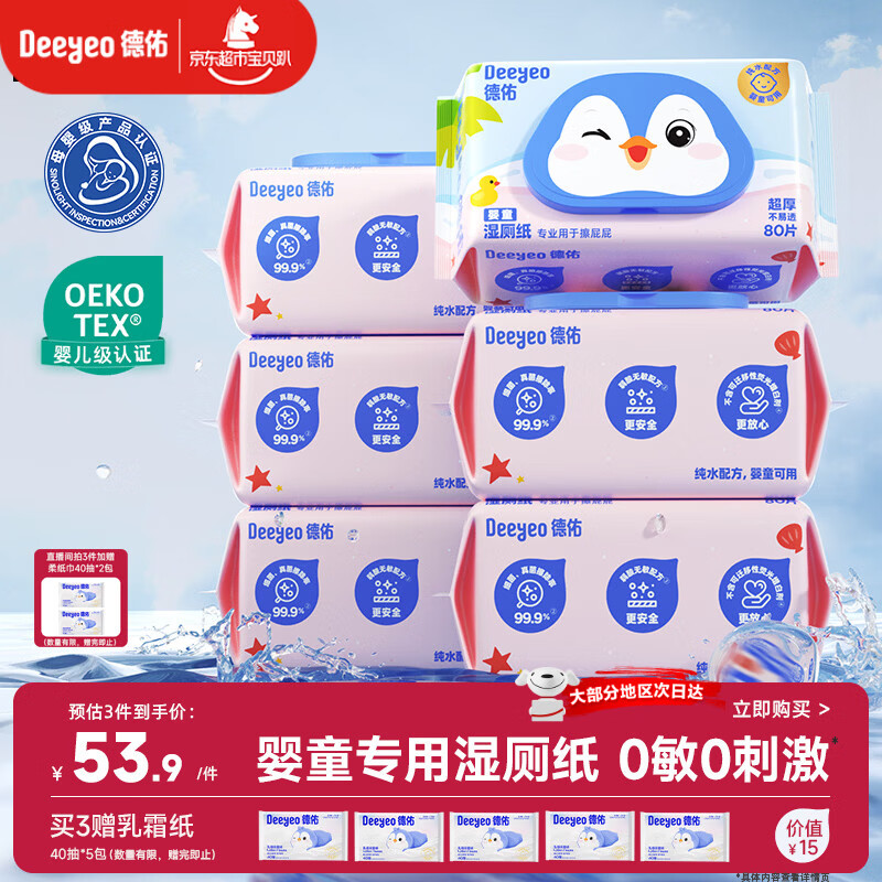 德佑婴童纯水湿厕纸家庭装80抽*6包 擦屁屁专用厕纸湿纸巾可冲入马桶