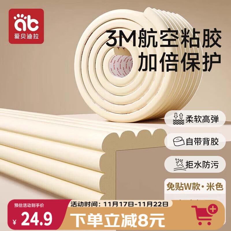 爱贝迪拉(AIBEDILA)防撞条儿童防撞角宝宝墙角桌角W型3m胶免贴加厚防护贴4米 燕麦色