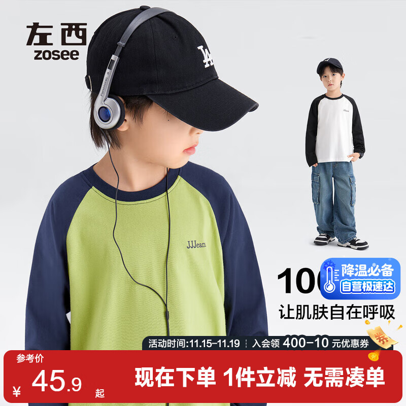 左西男童长袖T恤2025春秋款儿童纯棉打底衫插肩撞色百搭 牛油果绿 120