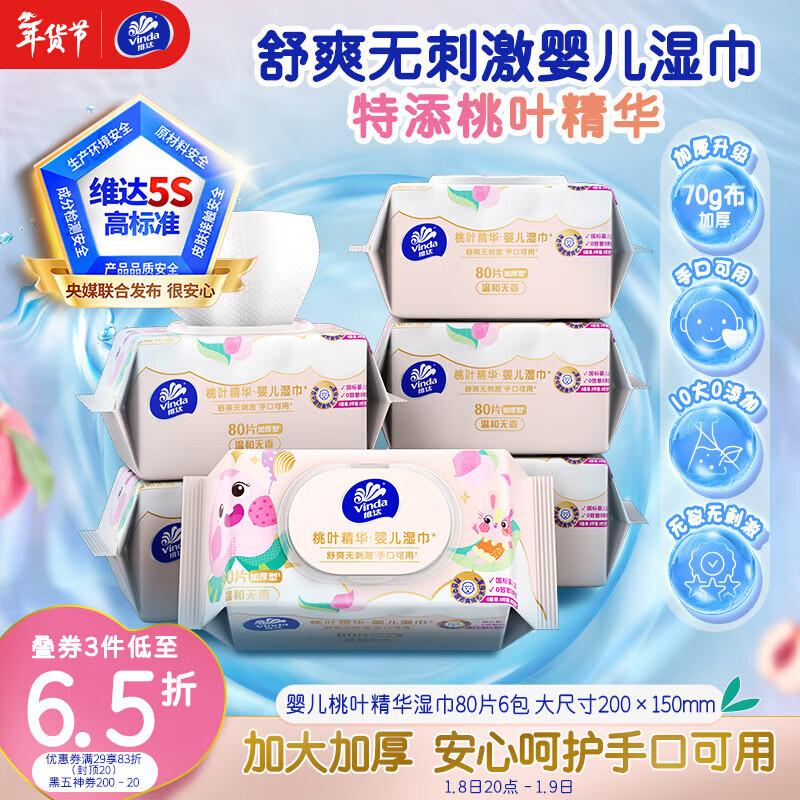 维达(Vinda)婴儿手口湿巾80片*6包 桃叶精华加厚加大手口专用亲肤湿纸巾大包