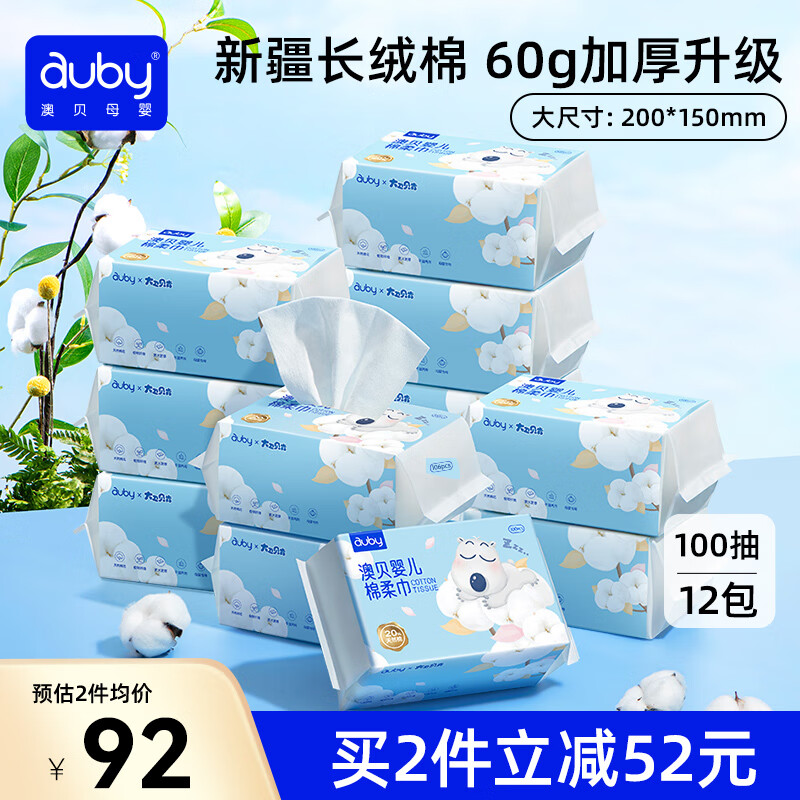澳贝(auby)婴儿棉柔巾干湿两用宝宝专用新生儿柔纸洗脸巾一次性100抽*12包