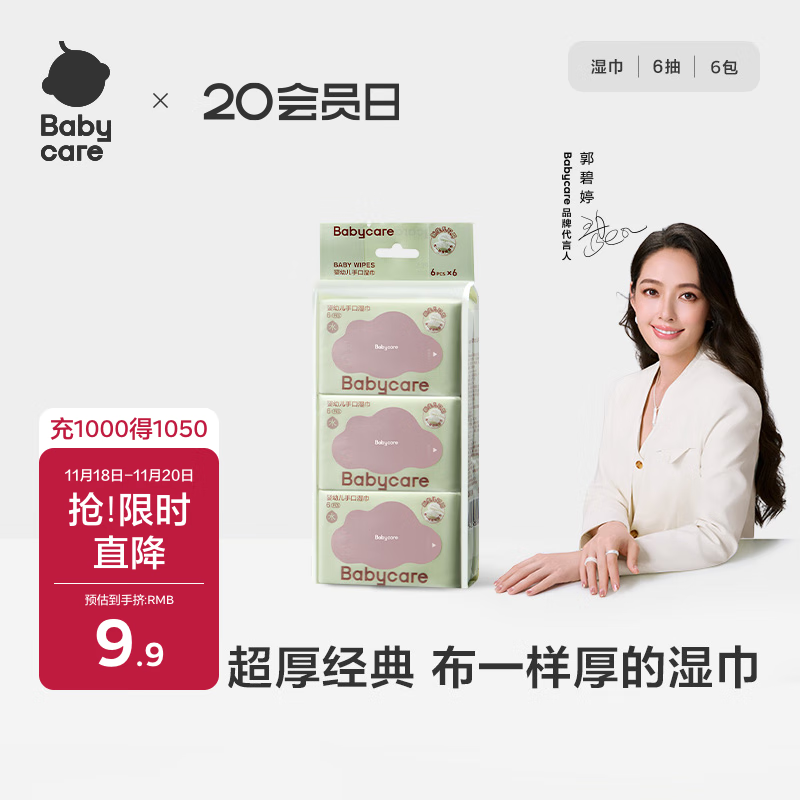 babycare婴儿手口湿巾加厚擦脸湿纸巾小包便携出行6480紫盖湿巾6抽*6包
