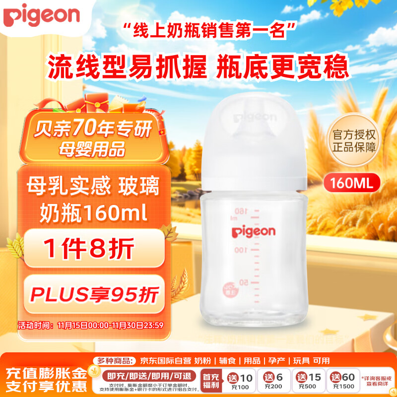 贝亲(Pigeon)婴儿宝宝玻璃奶瓶 防胀气奶瓶 第3代 宽口径自带奶嘴SS号160ml