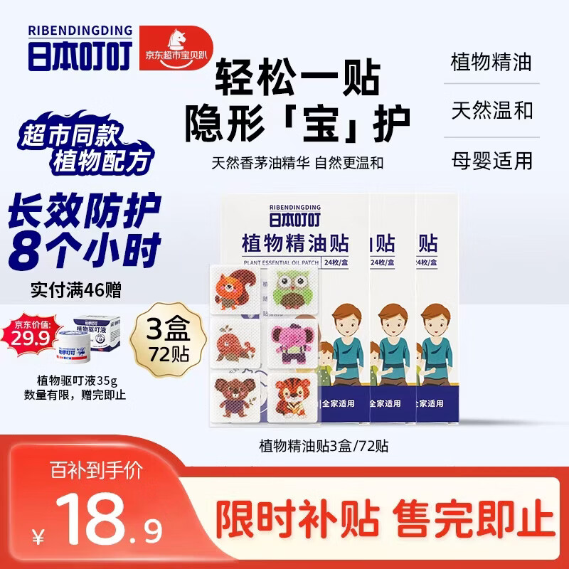 日本叮叮植物精油防叮贴宝宝儿童成人户外防护驱叮贴神器 防叮贴3盒72贴