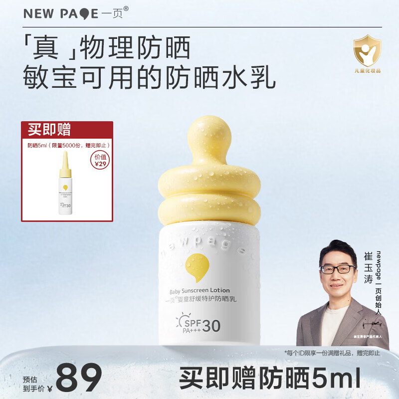一页小奶瓶防晒宝宝春游必备纯物理防晒SPF30防水防汗儿童防晒霜40ml