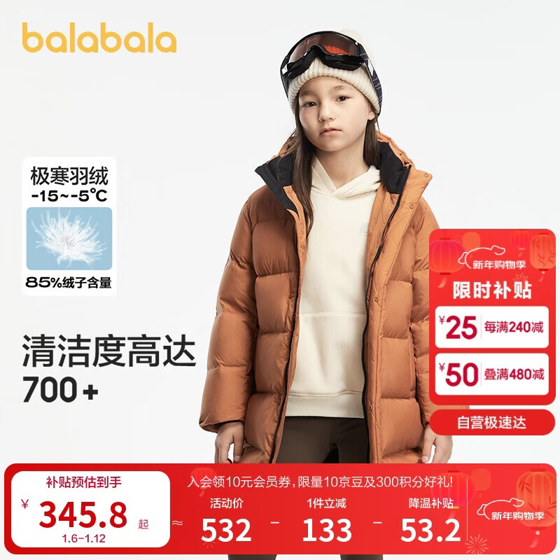 巴拉巴拉运动24冬儿童长款羽绒服防寒保暖中长款外套【bp】208424107213