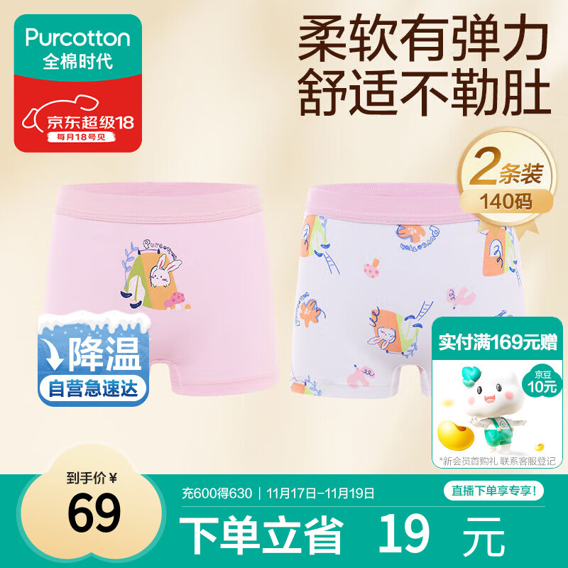 全棉时代儿童内裤女童平角裤宝宝全棉中大童内裤 粉红+花朵 140cm