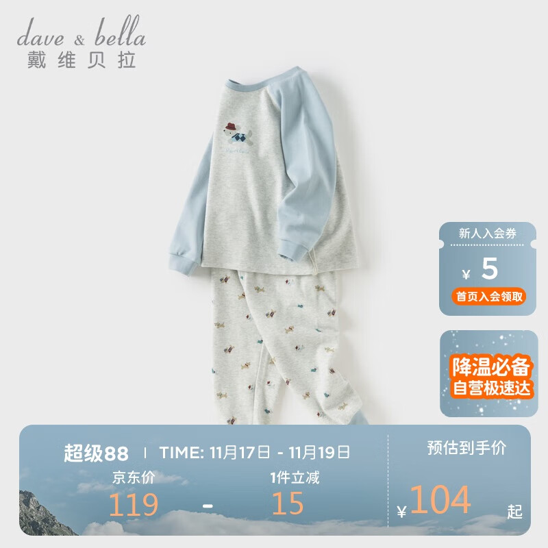 戴维贝拉男童抗菌内衣套装秋装宝宝印花两件套儿童睡衣