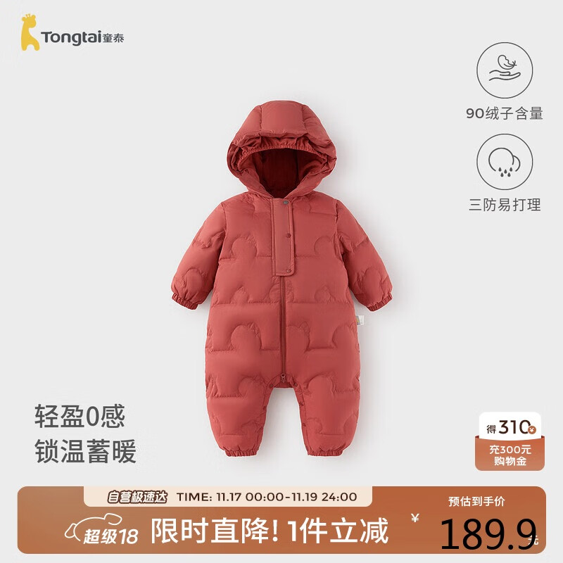 童泰(TONGTAI)婴儿羽绒服连体衣冬季宝宝哈衣男女童三防连帽鸭绒服红色90cm