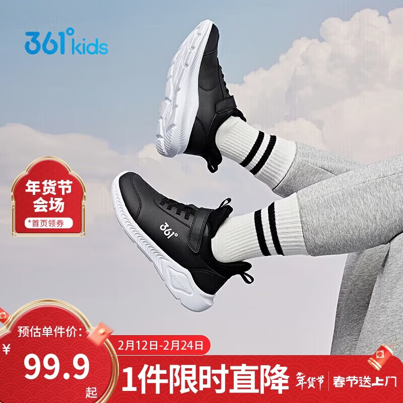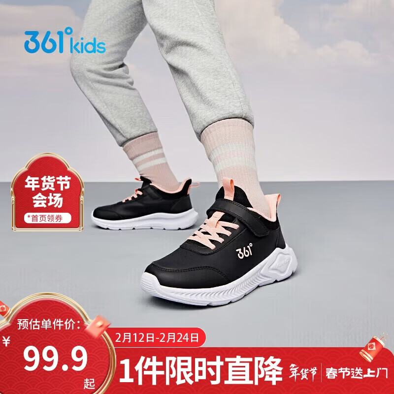 361°童鞋 儿童运动鞋25冬季男女童3-14岁皮革校园跑鞋 黑34