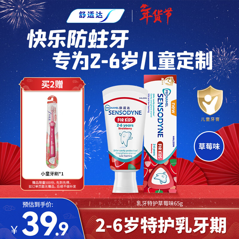 舒适达护釉健儿童牙膏2-6岁防蛀含氟 65g草莓味 护龈固齿 热门商品