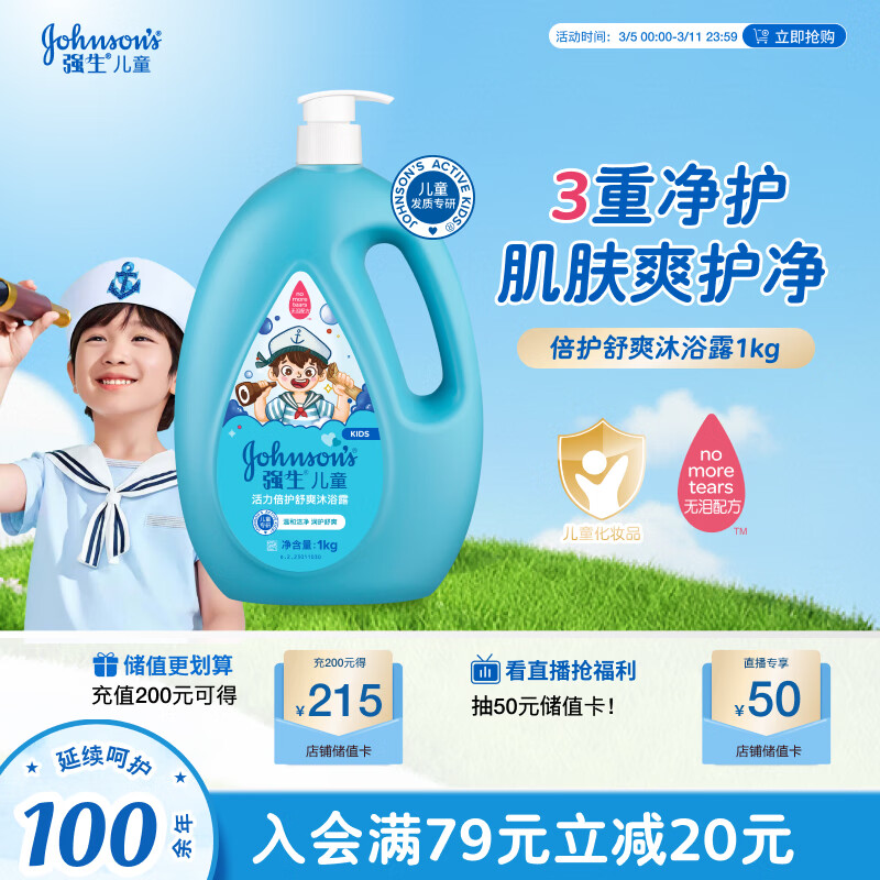 强生(Johnson)儿童倍护舒爽沐浴露1kg 青少年3-6-12岁专用温和清洁去汗易冲洗
