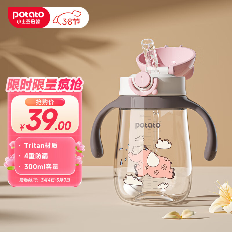 小土豆(potato)儿童水杯宝宝水杯带重力球吸管带手柄开学喝水杯 300ml蜜桃粉