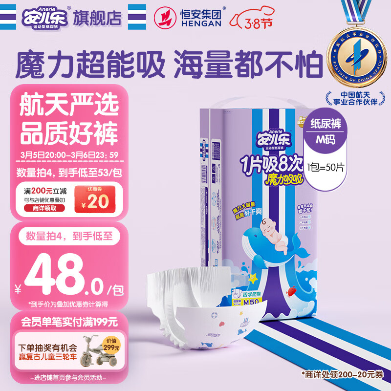 安儿乐(Anerle)魔力吸吸纸尿裤M50片(6-11kg)透气大吸量尿不湿【夜用专研】