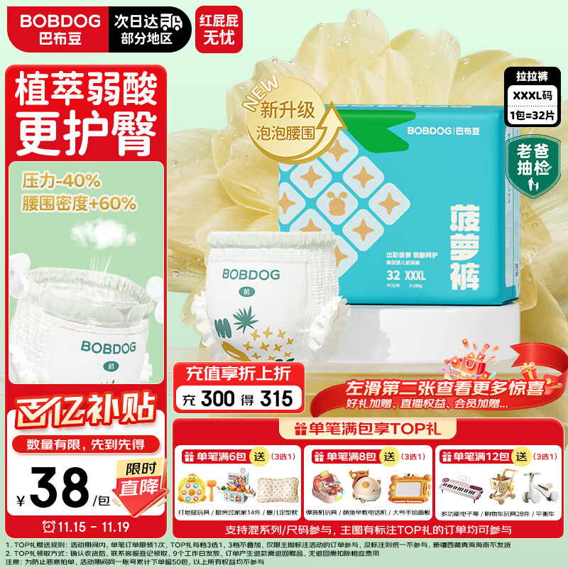 巴布豆(BOBDOG)新菠萝拉拉裤XXXL32片(17kg以上)婴儿尿不湿 超薄
