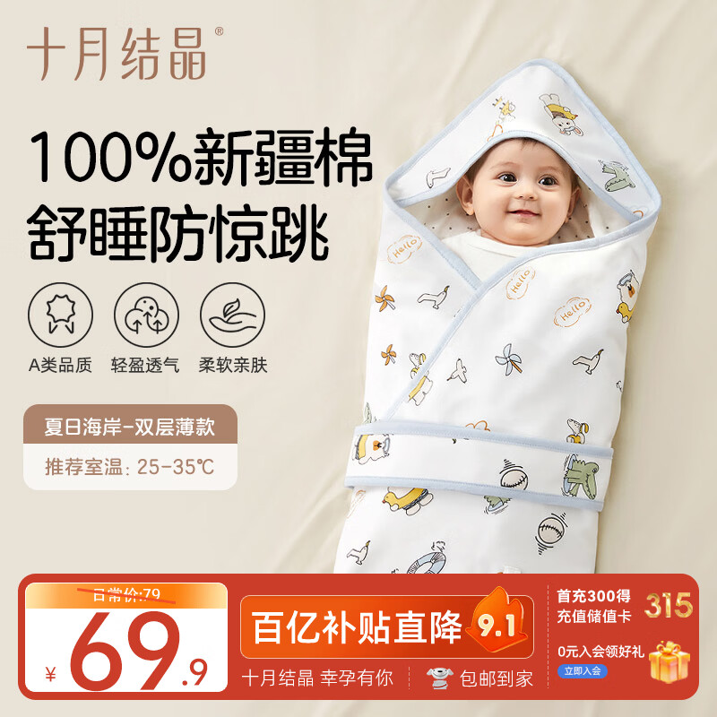 十月结晶婴儿抱被双层薄款保暖透气可调节绑带防蹬被襁褓 夏日海岸90*90