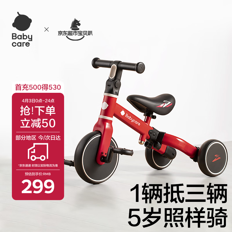 babycare儿童三轮车宝宝平衡脚踏车多功能二合一学步滑步车1-5岁 罗拉红