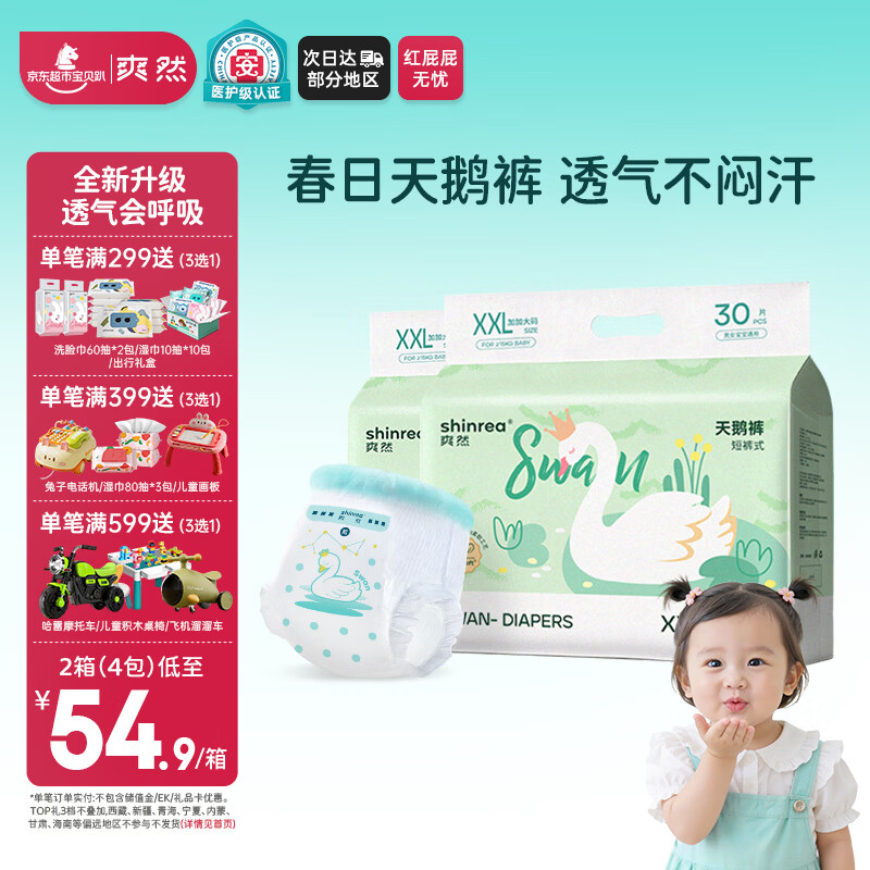 爽然(shinrea)天鹅拉拉裤XXL60片亲肤柔软透气男女通用箱装尿不湿【透爽散热】