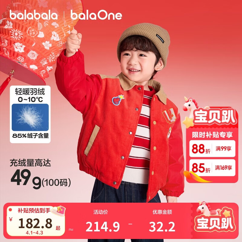 巴拉巴拉童装儿童羽绒服男童春装2025新款棒球服宝宝外套拜年服红色上衣潮