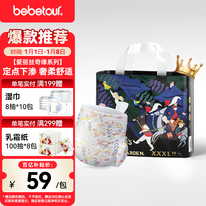 bebetour爱丽丝奇缘拉拉裤3XL30片(17kg以上)夜用尿不湿奢柔舒适定点下渗