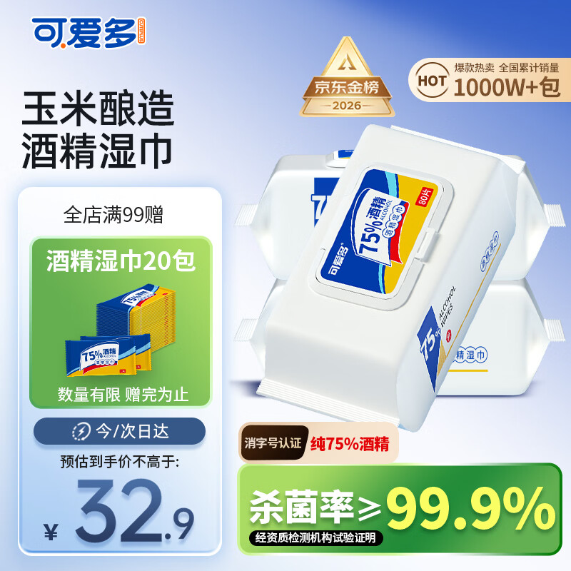 可爱多75%酒精湿巾 杀菌消毒湿纸巾80抽*3包 大包带盖 家用办公卫生湿巾